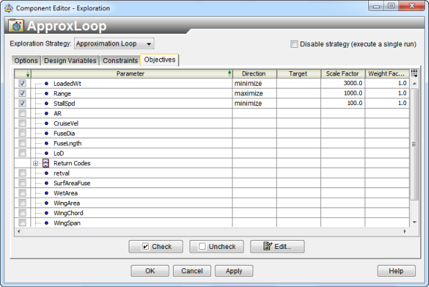Enter the Direction, Scale Factor, and Weight Factor for the selected objectives as follows: