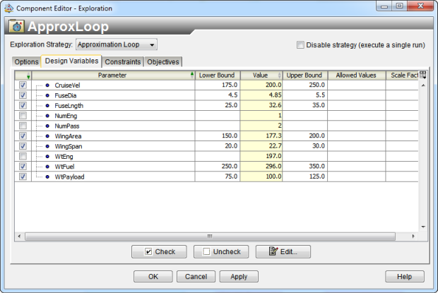 Click the Design Variables tab, and click in the checkbox to the left of the parameter name to select the following parameters to use as design variables: